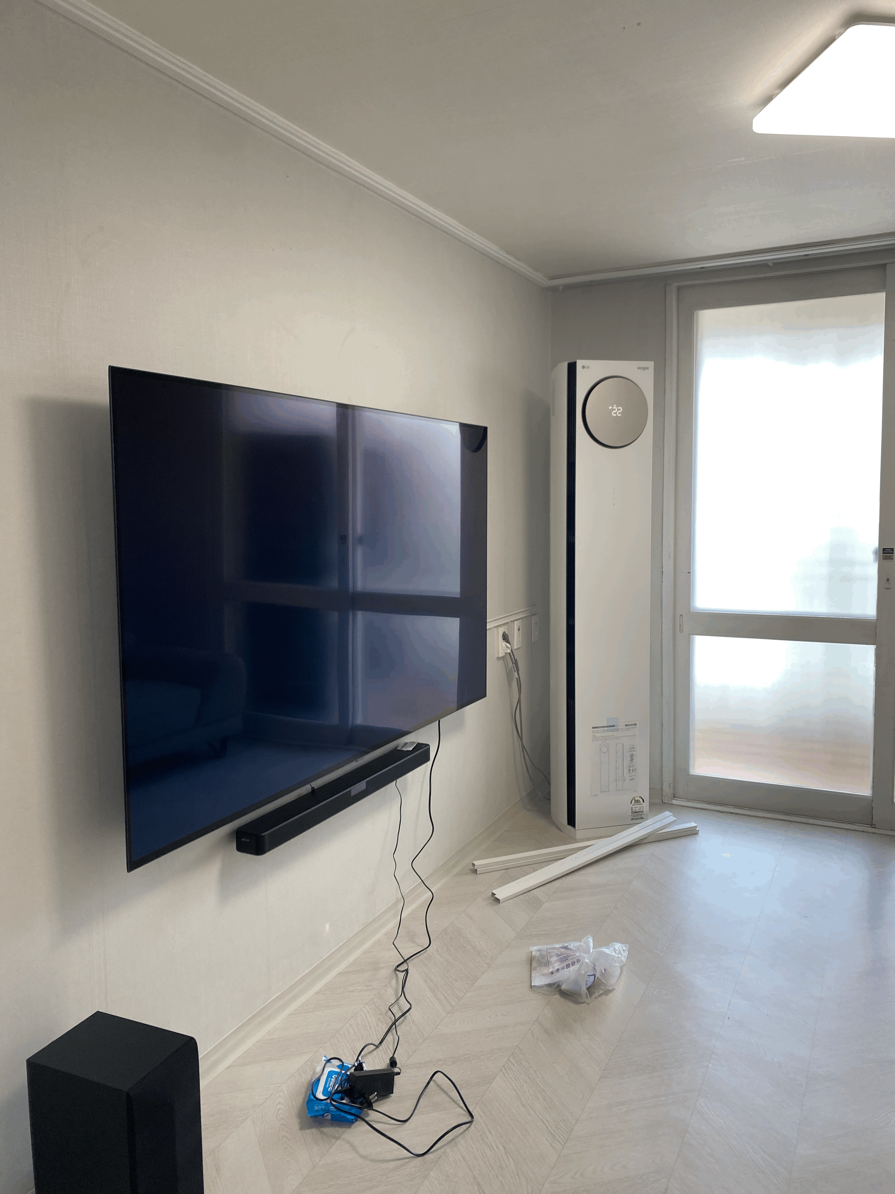 거실에 tv수납장과 쇼파까지 두면 너무 좁아 보일 것 같아서 수납장을 포기하고, tv를 벽걸이로 설치했다.